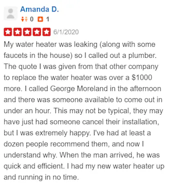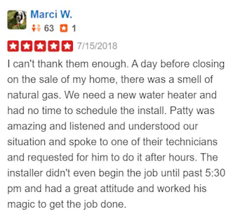 "Woke up to a leaking water heater. Within 2 hours, Joe showed up with a new water heater. All fixed and the old one removed. Great and friendly service. No hassle and lots of hot water again! Thank you." -Marsha S